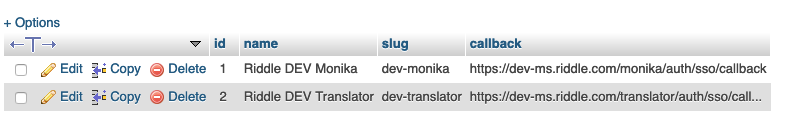 Die Spalte ‚callback‘ ist quasi immer die Base URL des Microservices plus ‚/auth/sso/callback‘. Wenn falsch gesetzt, meckert aber auch der SSO Microservice 🙂