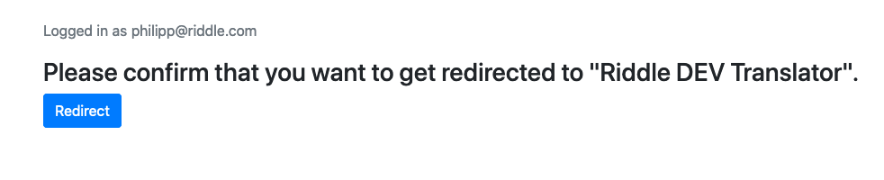 - Nach der Authentifizierung mit E-Mail & Passwort kommt eine Bestätigungsseite – nach dem Druck auf Redirect ist man dann im jeweiligen Microservice angemeldet und die Rollen wurden übergeben
